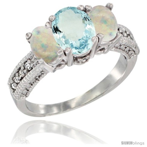 10K White Gold Ladies Oval Natural Aquamarine 3-Stone Ring with Opal Sides Diamond Accent
