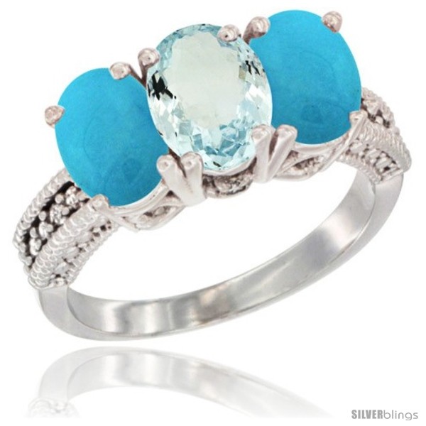 10K White Gold Natural Aquamarine & Turquoise Ring 3-Stone Oval 7x5 mm Diamond Accent