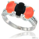 10K White Gold Natural Black Onyx & Coral Sides Ring 3-Stone Oval 7x5 mm Diamond Accent