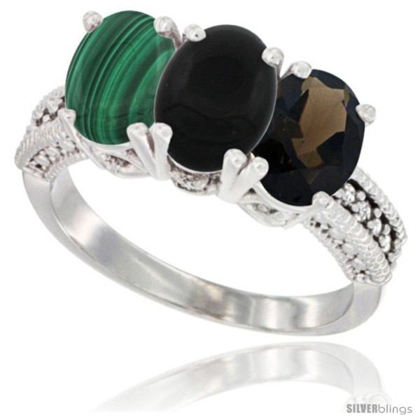 10K White Gold Natural Smoky Topaz, Black Onyx & Malachite Ring 3-Stone Oval 7x5 mm Diamond Accent