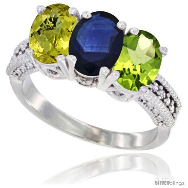 10K White Gold Natural Peridot, Blue Sapphire & Lemon Quartz Ring 3-Stone Oval 7x5 mm Diamond Accent