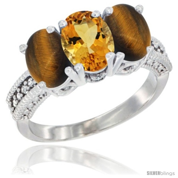 10K White Gold Natural Citrine & Tiger Eye Ring 3-Stone Oval 7x5 mm Diamond Accent