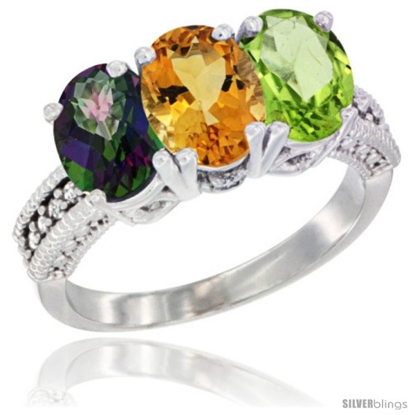 10K White Gold Natural Mystic Topaz, Citrine & Peridot Ring 3-Stone Oval 7x5 mm Diamond Accent