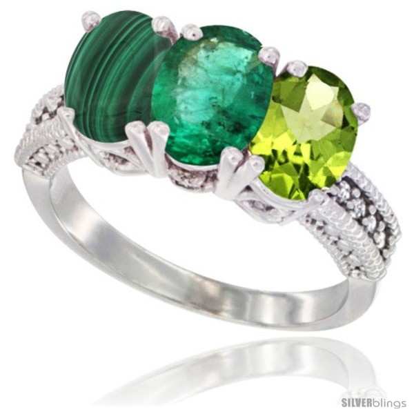 10K White Gold Natural Peridot, Emerald & Malachite Ring 3-Stone Oval 7x5 mm Diamond Accent