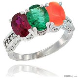 10K White Gold Natural Ruby, Emerald & Coral Ring 3-Stone Oval 7x5 mm Diamond Accent