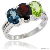 10K White Gold Natural London Blue Topaz, Garnet & Peridot Ring 3-Stone Oval 7x5 mm Diamond Accent