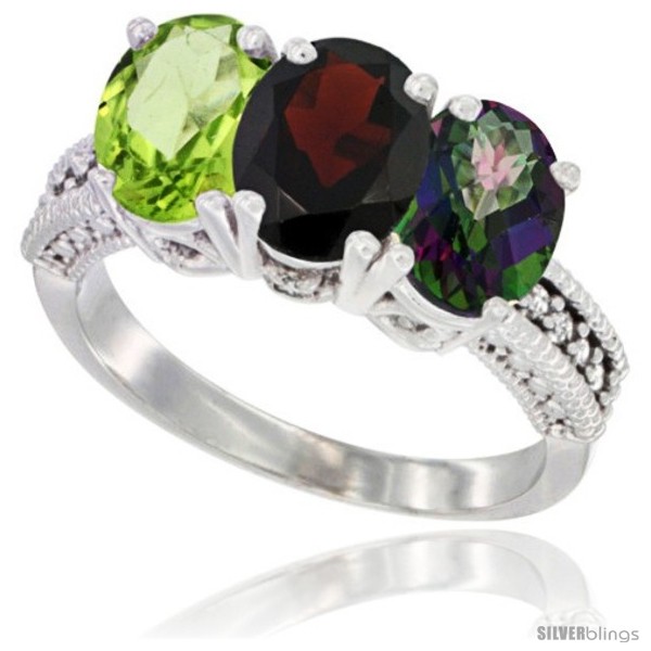 10K White Gold Natural Mystic Topaz, Garnet & Peridot Ring 3-Stone Oval 7x5 mm Diamond Accent