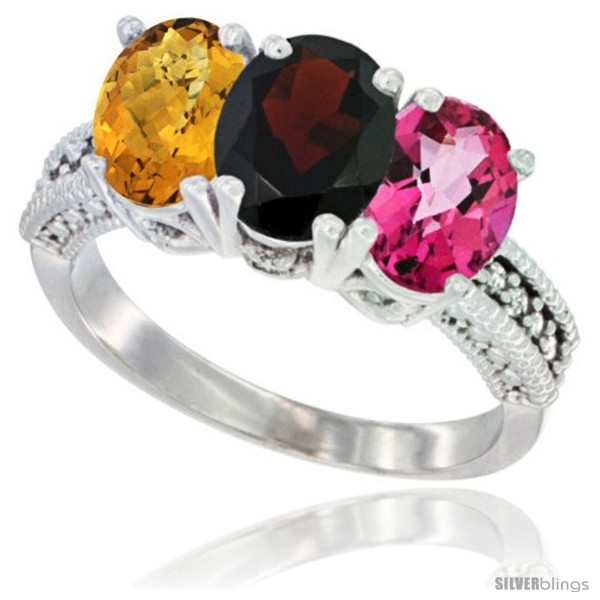 10K White Gold Natural Pink Topaz, Garnet & Whisky Quartz Ring 3-Stone Oval 7x5 mm Diamond Accent