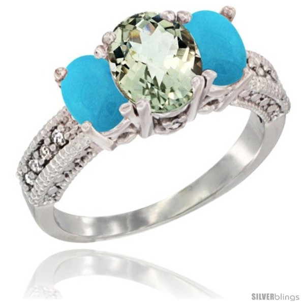10K White Gold Ladies Oval Natural Green Amethyst 3-Stone Ring with Turquoise Sides Diamond Accent