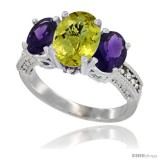 10K White Gold Ladies Natural Lemon Quartz Oval 3 Stone Ring with Amethyst Sides Diamond Accent