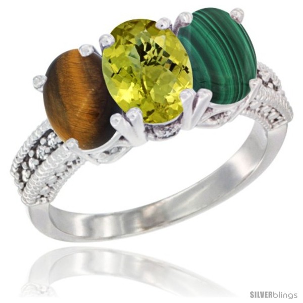 10K White Gold Natural Tiger Eye, Lemon Quartz & Malachite Ring 3-Stone Oval 7x5 mm Diamond Accent