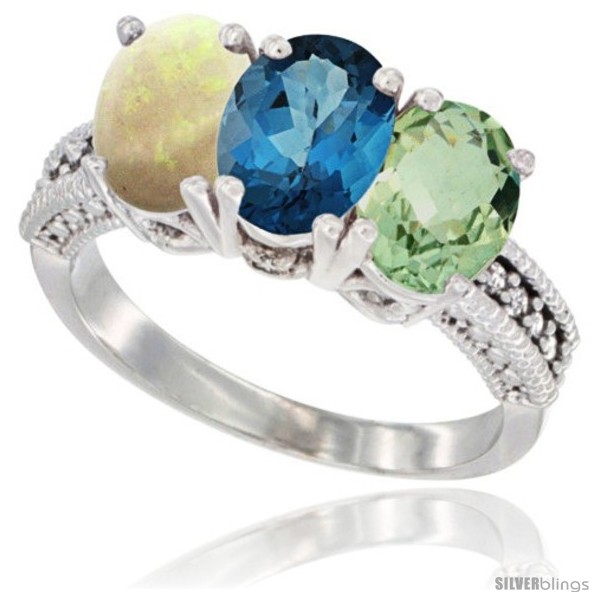 10K White Gold Natural Green Amethyst, London Blue Topaz & Opal Ring 3-Stone Oval 7x5 mm Diamond Accent