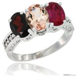 10K White Gold Natural Garnet, Morganite & Ruby Ring 3-Stone Oval 7x5 mm Diamond Accent