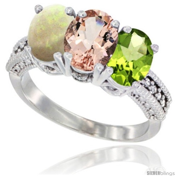 10K White Gold Natural Peridot, Morganite & Opal Ring 3-Stone Oval 7x5 mm Diamond Accent