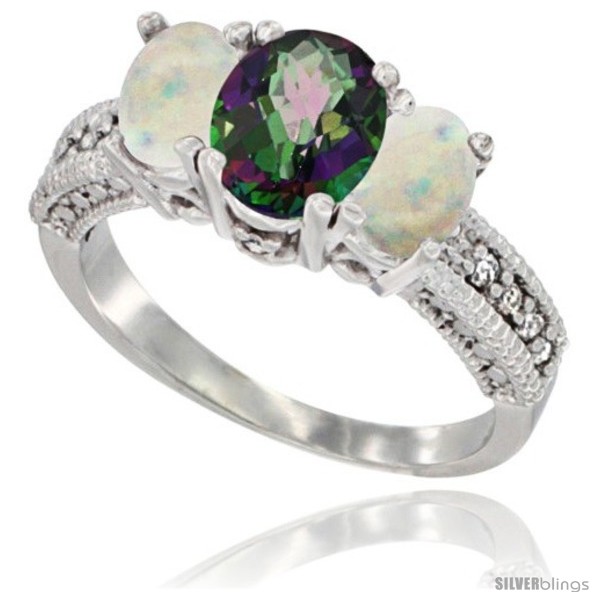 10K White Gold Ladies Oval Natural Mystic Topaz 3-Stone Ring with Opal Sides Diamond Accent