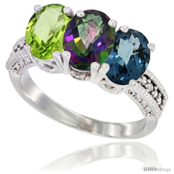 10K White Gold Natural London Blue Topaz, Mystic Topaz & Peridot Ring 3-Stone Oval 7x5 mm Diamond Accent