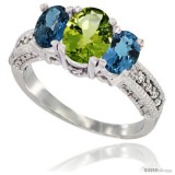 10K White Gold Ladies Oval Natural Peridot 3-Stone Ring with London Blue Topaz Sides Diamond Accent
