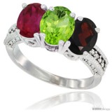10K White Gold Natural Garnet, Peridot & Ruby Ring 3-Stone Oval 7x5 mm Diamond Accent