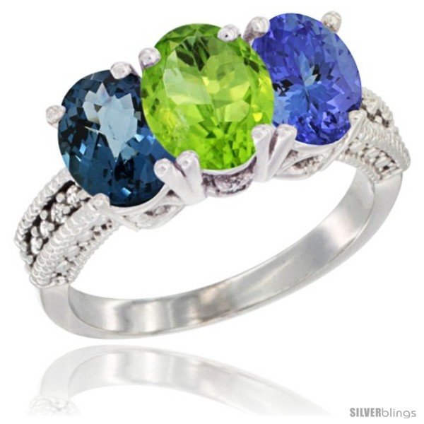 10K White Gold Natural London Blue Topaz, Peridot & Tanzanite Ring 3-Stone Oval 7x5 mm Diamond Accent