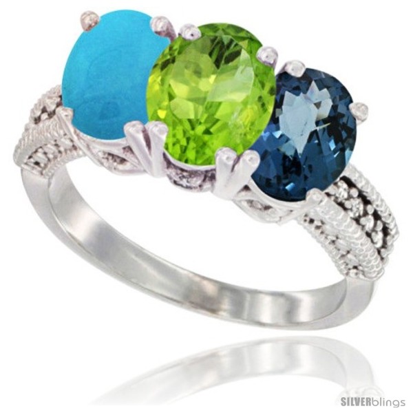 10K White Gold Natural London Blue Topaz, Peridot & Turquoise Ring 3-Stone Oval 7x5 mm Diamond Accent