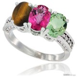10K White Gold Natural Green Amethyst, Pink Topaz & Tiger Eye Ring 3-Stone Oval 7x5 mm Diamond Accent