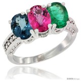 10K White Gold Natural London Blue Topaz, Pink Topaz & Emerald Ring 3-Stone Oval 7x5 mm Diamond Accent