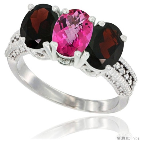 10K White Gold Natural Pink Topaz & Garnet Sides Ring 3-Stone Oval 7x5 mm Diamond Accent