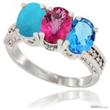 10K White Gold Natural Swiss Blue Topaz, Pink Topaz & Turquoise Ring 3-Stone Oval 7x5 mm Diamond Accent