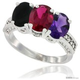 10K White Gold Natural Amethyst, Ruby & Black Onyx Ring 3-Stone Oval 7x5 mm Diamond Accent