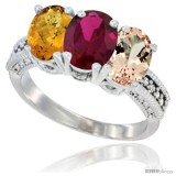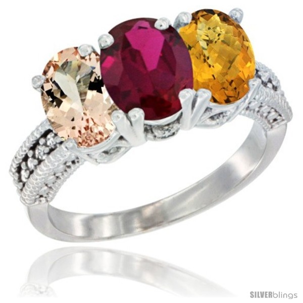 10K White Gold Natural Morganite, Ruby & Whisky Quartz Ring 3-Stone Oval 7x5 mm Diamond Accent