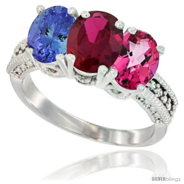 10K White Gold Natural Pink Topaz, Ruby & Tanzanite Ring 3-Stone Oval 7x5 mm Diamond Accent