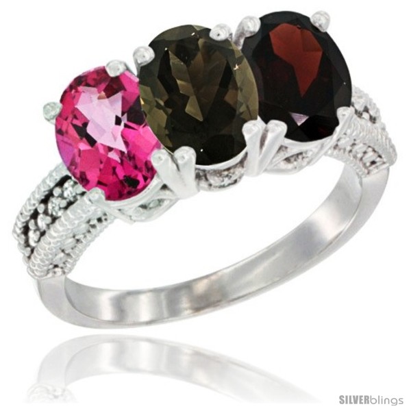 10K White Gold Natural Pink Topaz, Smoky Topaz & Garnet Ring 3-Stone Oval 7x5 mm Diamond Accent