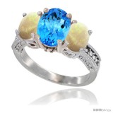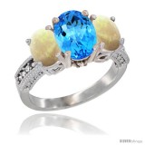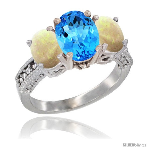 10K White Gold Ladies Natural Swiss Blue Topaz Oval 3 Stone Ring with Opal Sides Diamond Accent