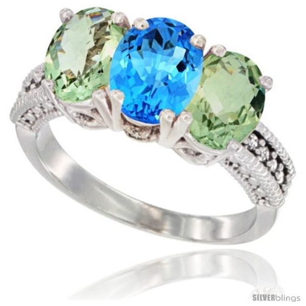 10K White Gold Natural Swiss Blue Topaz & Green Amethyst Sides Ring 3-Stone Oval 7x5 mm Diamond Accent