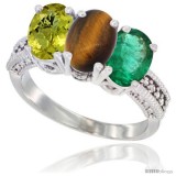 10K White Gold Natural Emerald, Tiger Eye & Lemon Quartz Ring 3-Stone Oval 7x5 mm Diamond Accent