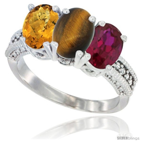 10K White Gold Natural Ruby, Tiger Eye & Whisky Quartz Ring 3-Stone Oval 7x5 mm Diamond Accent