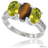 10K White Gold Natural Tiger Eye & Lemon Quartz Sides Ring 3-Stone Oval 7x5 mm Diamond Accent