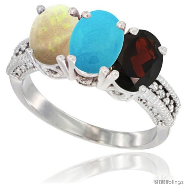10K White Gold Natural Garnet, Turquoise & Opal Ring 3-Stone Oval 7x5 mm Diamond Accent