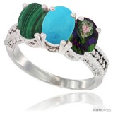 10K White Gold Natural Mystic Topaz, Turquoise & Malachite Ring 3-Stone Oval 7x5 mm Diamond Accent