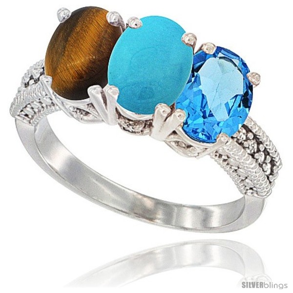 10K White Gold Natural Swiss Blue Topaz, Turquoise & Tiger Eye Ring 3-Stone Oval 7x5 mm Diamond Accent