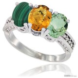10K White Gold Natural Green Amethyst, Whisky Quartz & Malachite Ring 3-Stone Oval 7x5 mm Diamond Accent