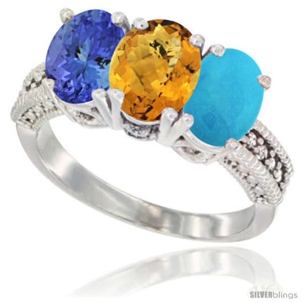 10K White Gold Natural Turquoise, Whisky Quartz & Tanzanite Ring 3-Stone Oval 7x5 mm Diamond Accent