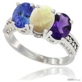 10K White Gold Natural Amethyst, Opal & Tanzanite Ring 3-Stone Oval 7x5 mm Diamond Accent