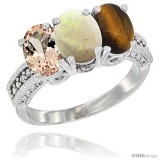 10K White Gold Natural Morganite, Opal & Tiger Eye Ring 3-Stone Oval 7x5 mm Diamond Accent