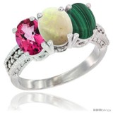 10K White Gold Natural Pink Topaz, Opal & Malachite Ring 3-Stone Oval 7x5 mm Diamond Accent