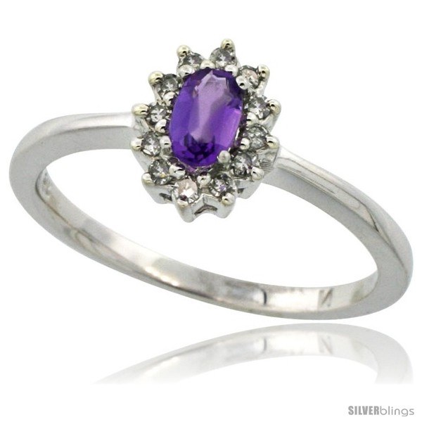 10k White Gold Diamond Halo Amethyst Ring 0.25 ct Oval Stone 5x3 mm, 5/16 in wide