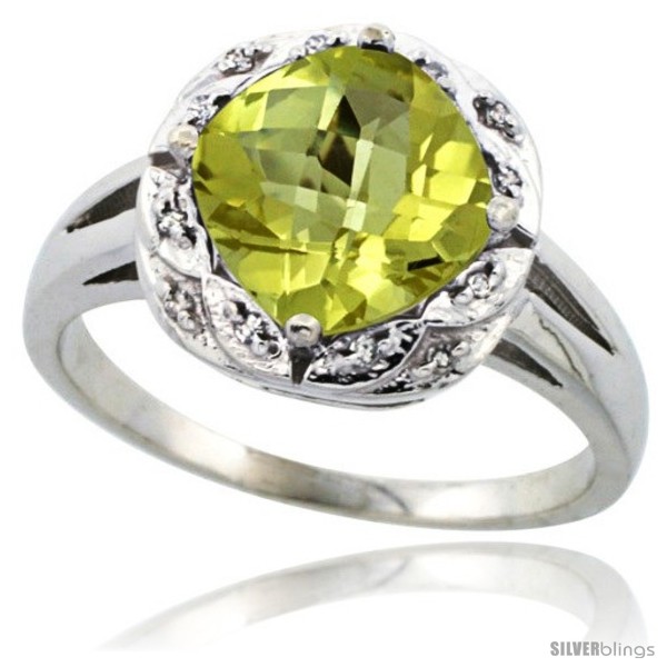 10k White Gold Diamond Halo Lemon Quartz Ring 2.7 ct Checkerboard Cut Cushion Shape 8 mm, 1/2 in wide