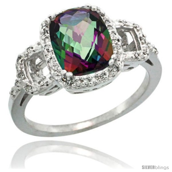 10k White Gold Diamond Mystic Topaz Ring 2 ct Checkerboard Cut Cushion Shape 9x7 mm, 1/2 in wide