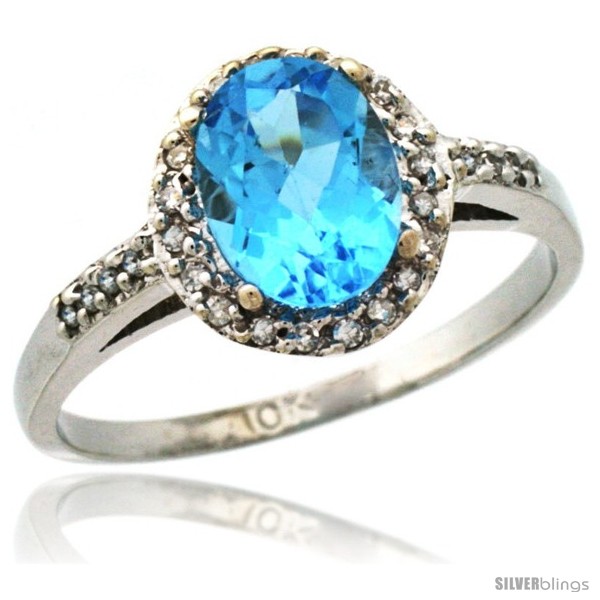 10k White Gold Diamond Swiss Blue Topaz Ring Oval Stone 8x6 mm 1.17 ct 3/8 in wide