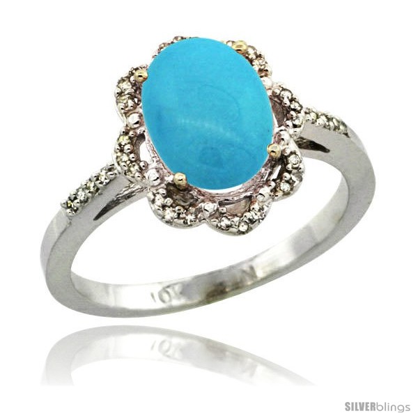 10k White Gold Diamond Halo Turquoise Ring 1.65 Carat Oval Shape 9X7 mm, 7/16 in (11mm) wide